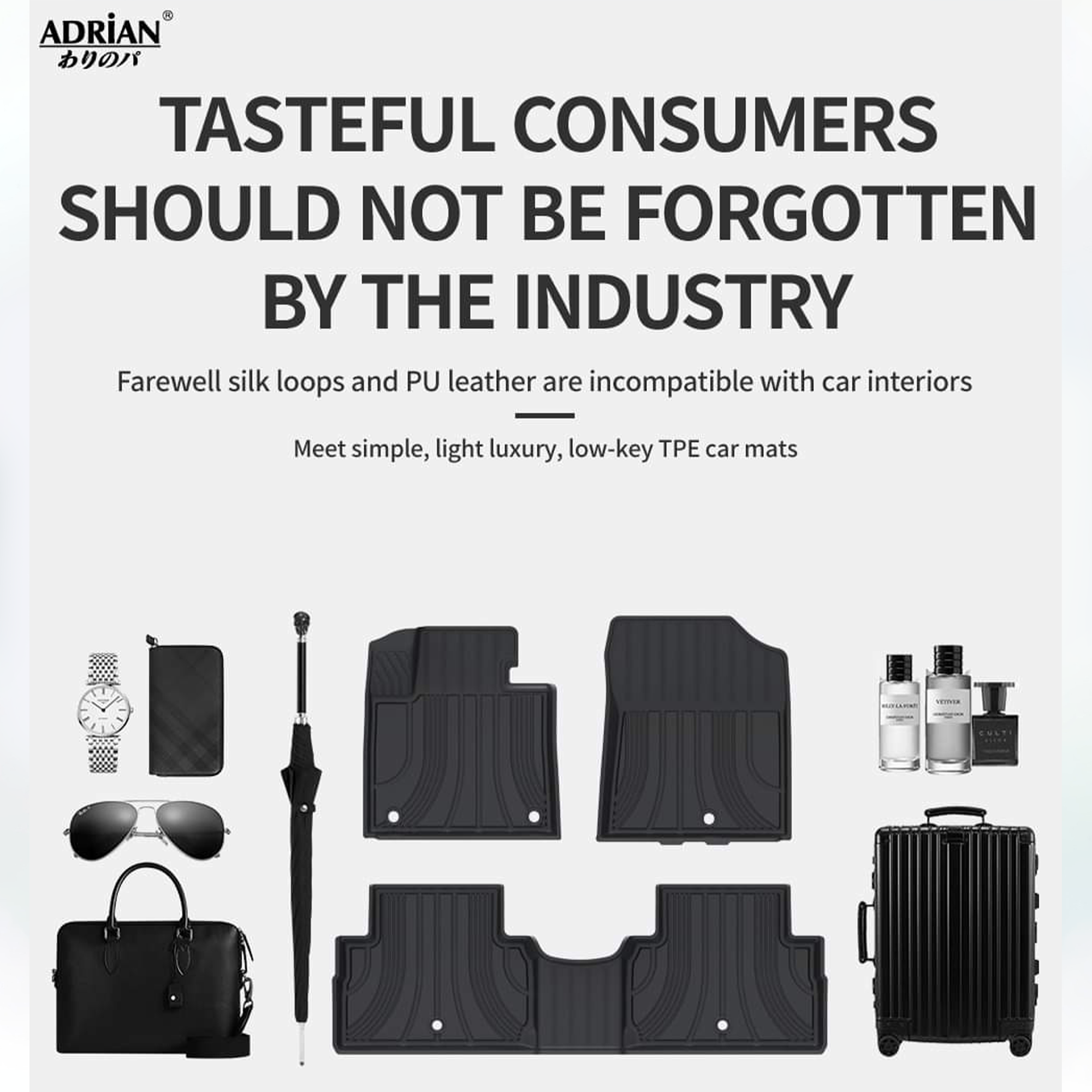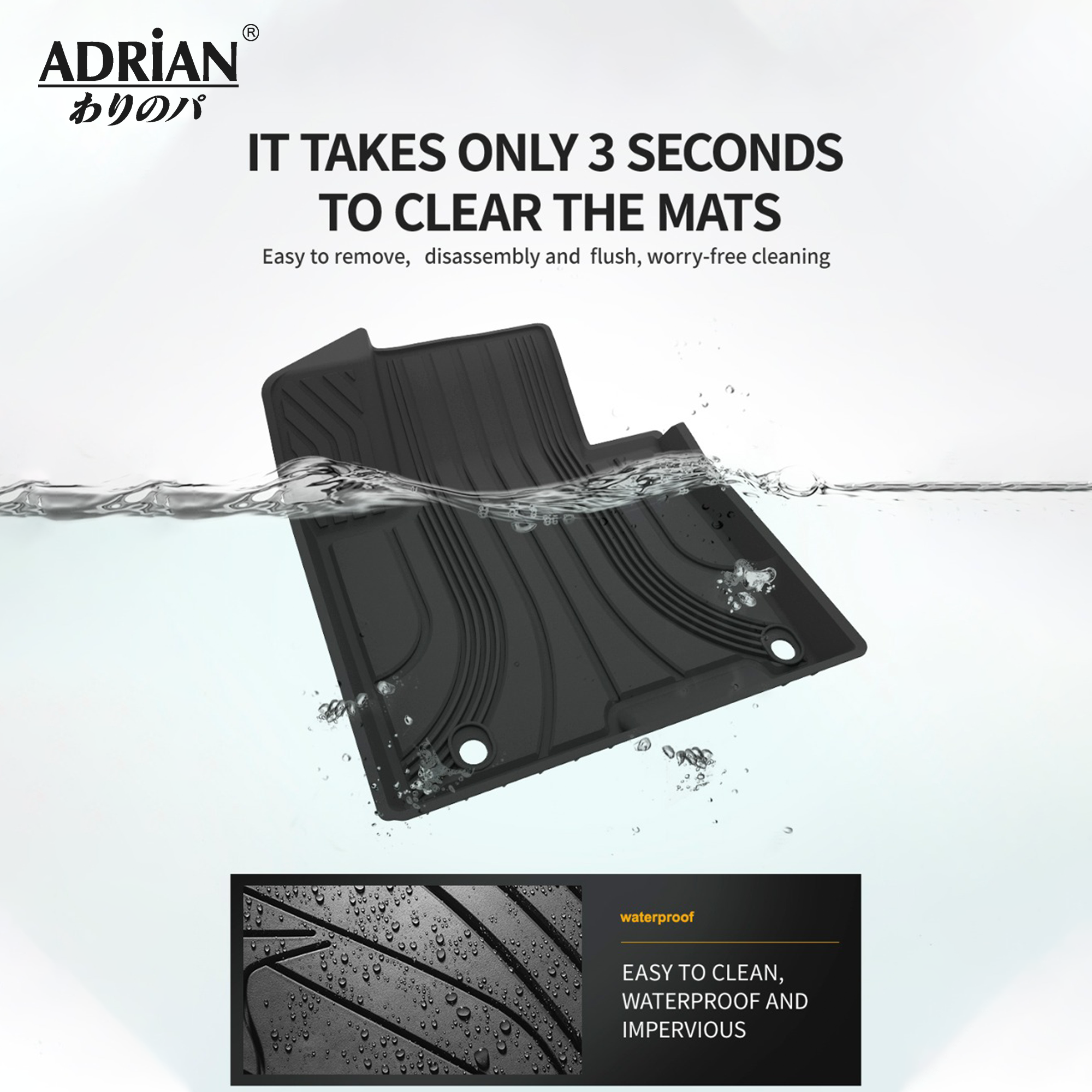 Adrian floor liners are made from 100% Brand-new Thermoplastic Elastomer (TPE), which is extremely elastic and wearable. It has a comfortable feeling of feet, prevent accidental skidding even when your feet are wet. The unique groove design also increases the friction of the mat, maintaining excellent durability even with prolonged use